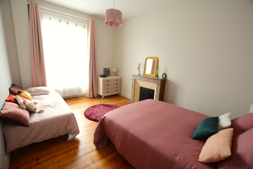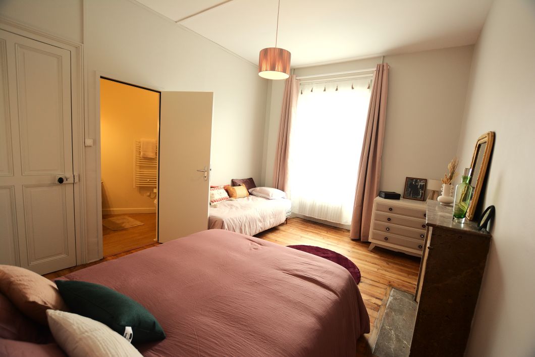 Avec sa décoration élégante, cette chambre aux colories vert et mauve rappel les landes en fleur et offre une ambiance chaleureuse. Situé au 1er étage elle dispose d’une literie 140×190 et d’un lit 1 personne (possibilité de rajouter un lit d’appoint). Salle d’eau privative.